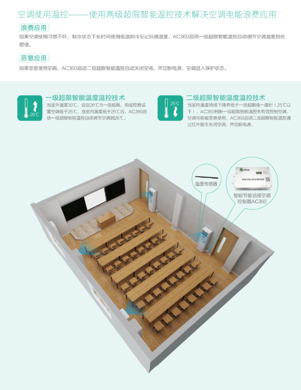 4)空調(diào)電源必須以單間教室為單位,可遠(yuǎn)程單獨(dú)或全部控制教室內(nèi)所有空調(diào)的電源開(kāi)關(guān);